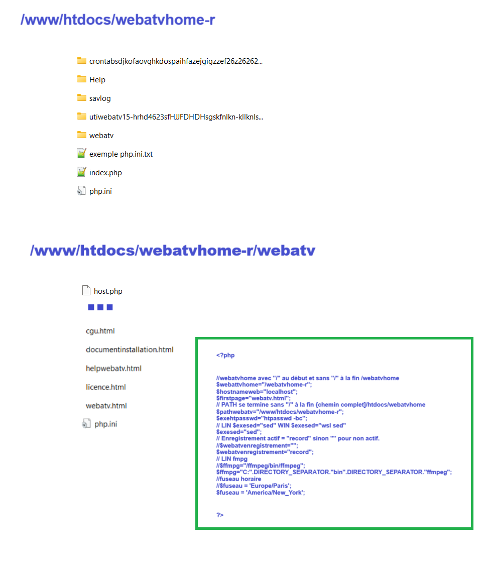 Les fichiers php.ini existants dans la racine du répertoire webatvhome et dans webatvhome/webatv sont à remplacer par les vôtres pour que php tienne compte de la configuration choisie.